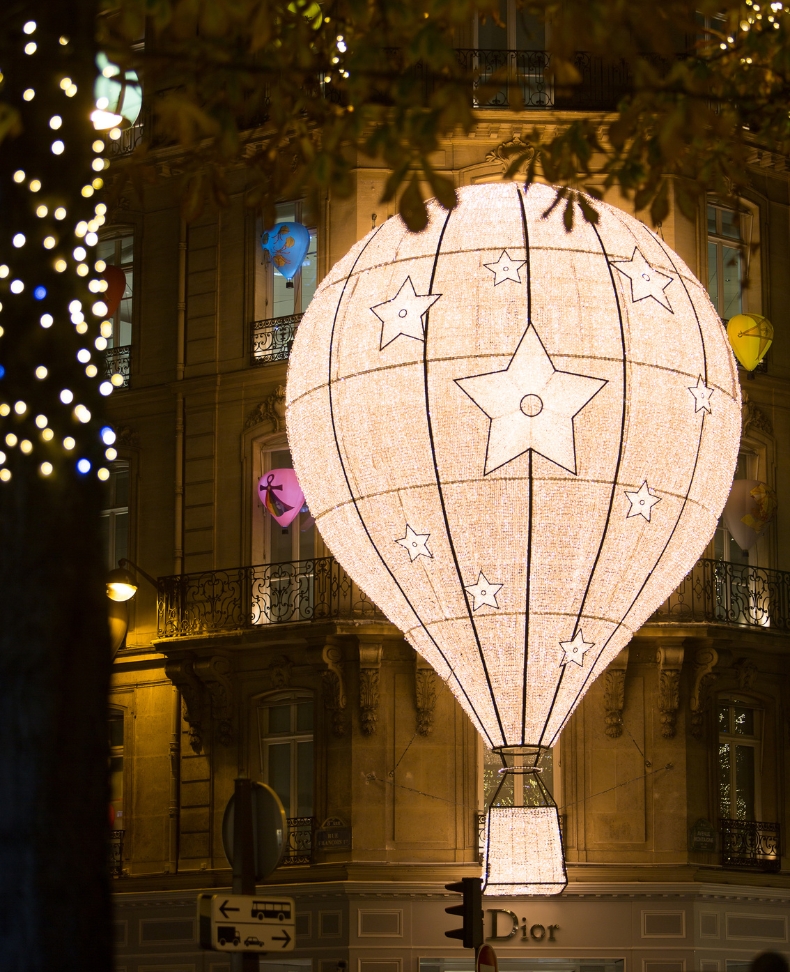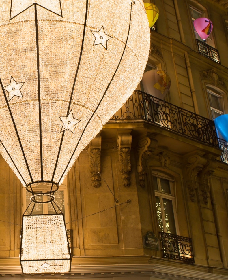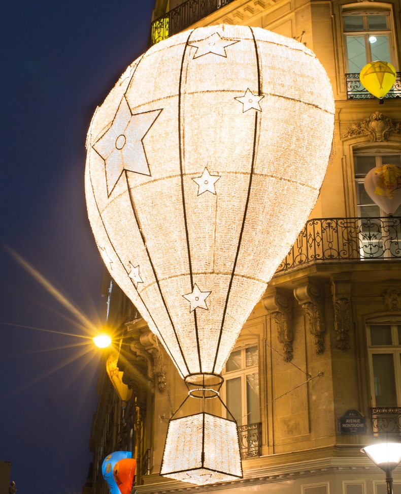 A luminous hot air balloon takes flight