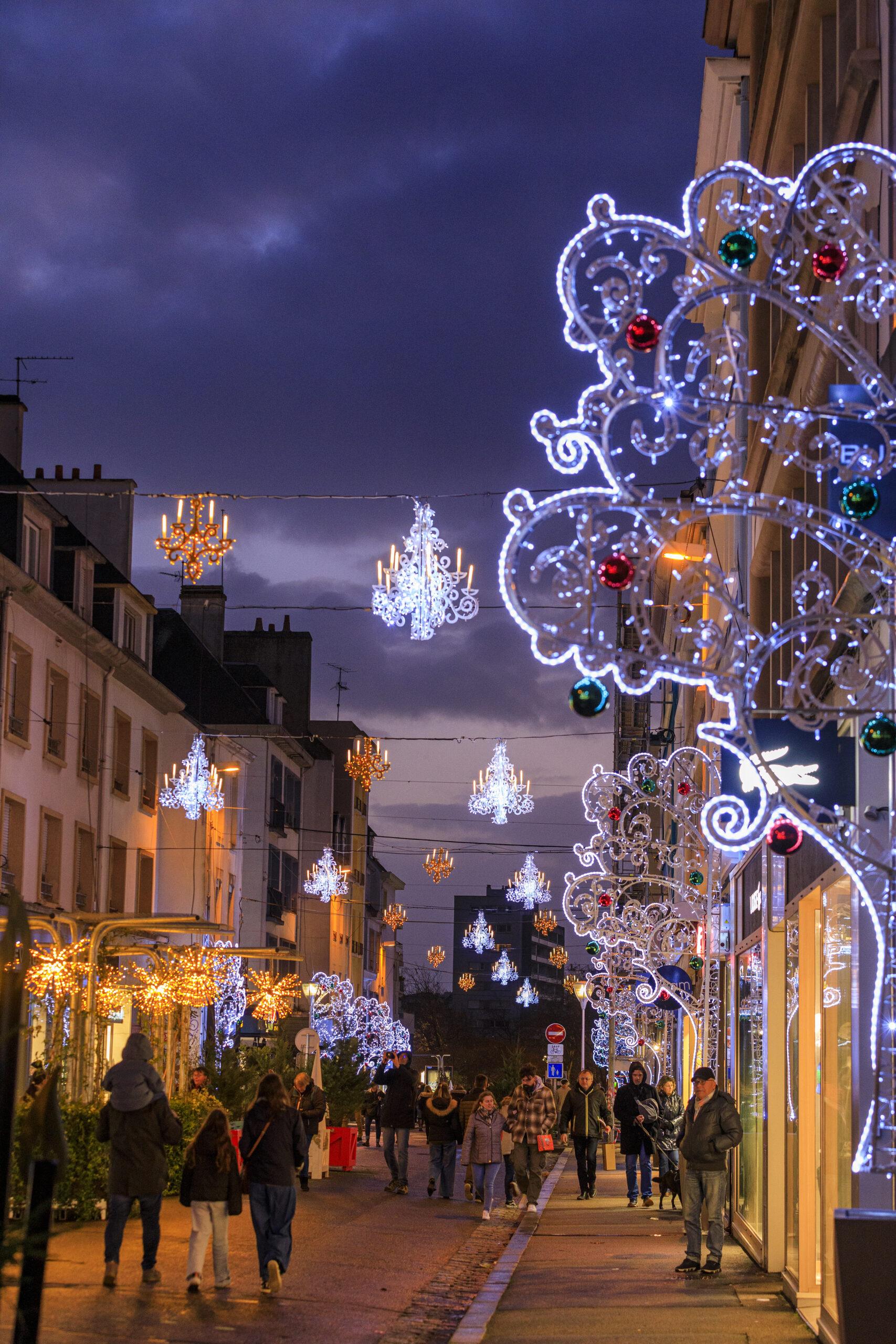 Lorient shines brightly with stunning baroque-inspired decorations, featuring elegant silhouettes of majestic trees and sparkling chandeliers. These luminous creations pay homage to the city’s rich history with the East India Company, blending grandeur with theatrical flair. The intricate patterns and radiant displays transform the avenues into a poetic celebration of Lorient’s heritage. Experience the timeless charm of this vibrant tribute, where history and artistry come to life.