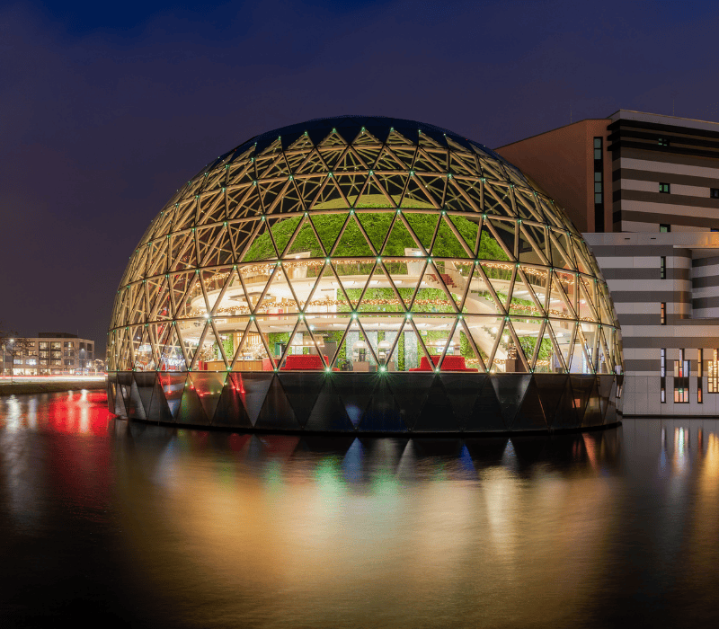 In het gebouw zijn verschillende decoratieve elementen toegepast die elkaar versterken. Gedecoreerde guirlandes zorgen voor een warme basis, terwijl een stijlvolle ringenboom een eigentijdse en representatieve uitstraling geeft. Het absolute middelpunt is de doorloopbare wereldbol op het podium in het restaurant. Een echte eye-catcher die direct de aandacht trekt en de ruimte karakter geeft.
