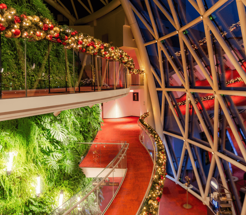 In het gebouw zijn verschillende decoratieve elementen toegepast die elkaar versterken. Gedecoreerde guirlandes zorgen voor een warme basis, terwijl een stijlvolle ringenboom een eigentijdse en representatieve uitstraling geeft. Het absolute middelpunt is de doorloopbare wereldbol op het podium in het restaurant. Een echte eye-catcher die direct de aandacht trekt en de ruimte karakter geeft.