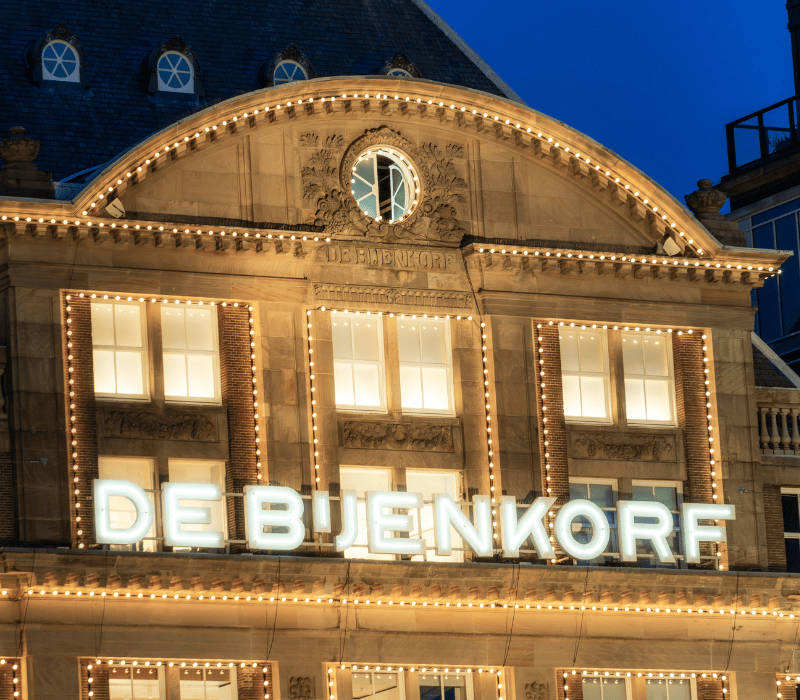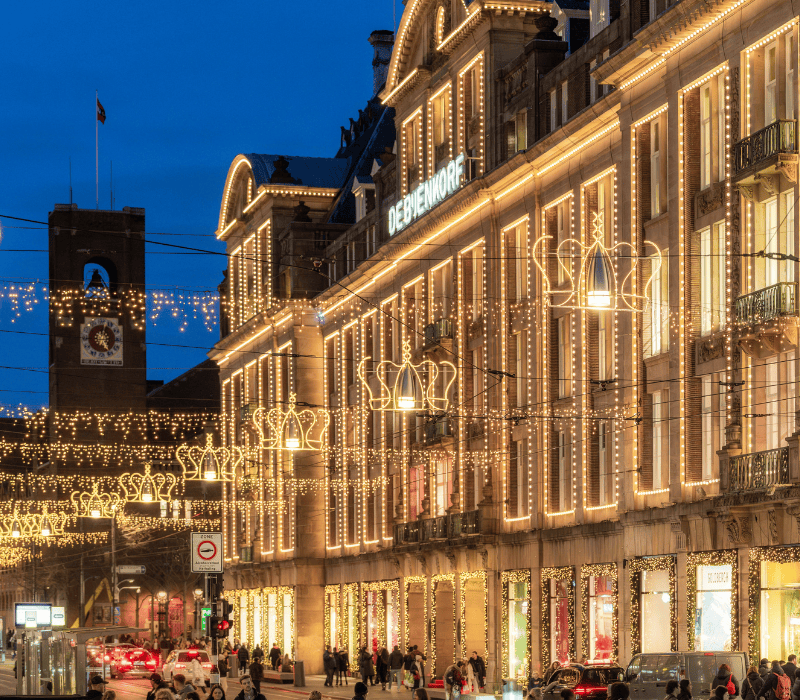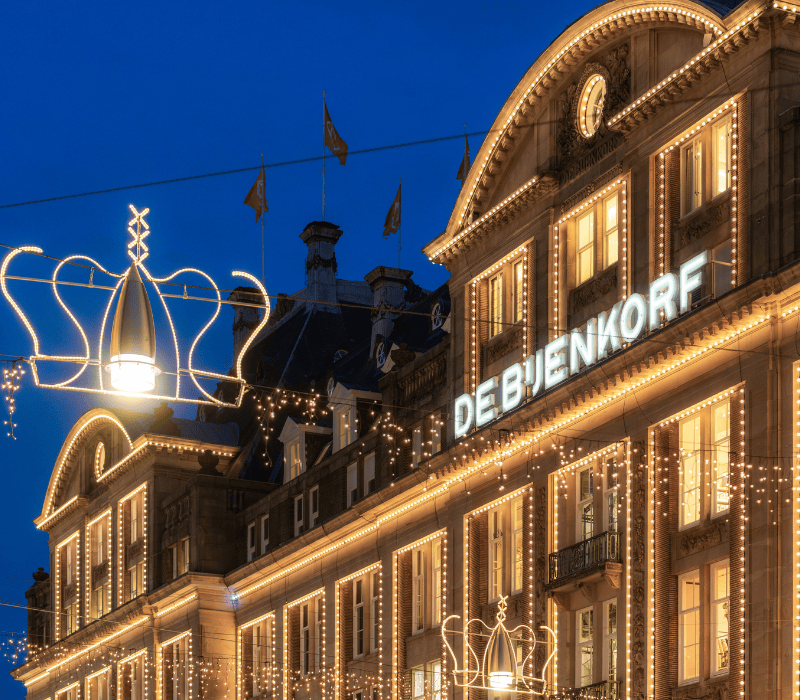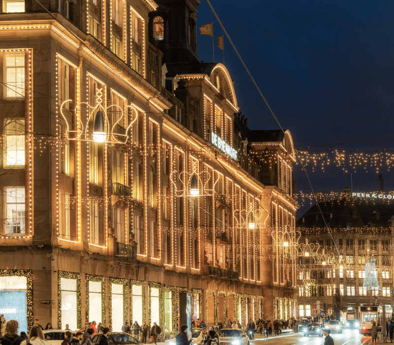 Voor De Bijenkorf Amsterdam is gekozen voor hoogwaardige kerstverlichting die past bij de schaal, ligging en uitstraling van het gebouw. Als één van de meest herkenbare warenhuizen van Nederland vraagt deze locatie om een verlichtingsconcept dat zowel elegant als indrukwekkend is. De toegepaste kerstverlichting benadrukt de klassieke architectuur en sluit aan bij de dynamiek van de Amsterdamse binnenstad.
