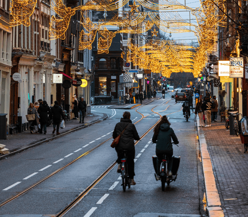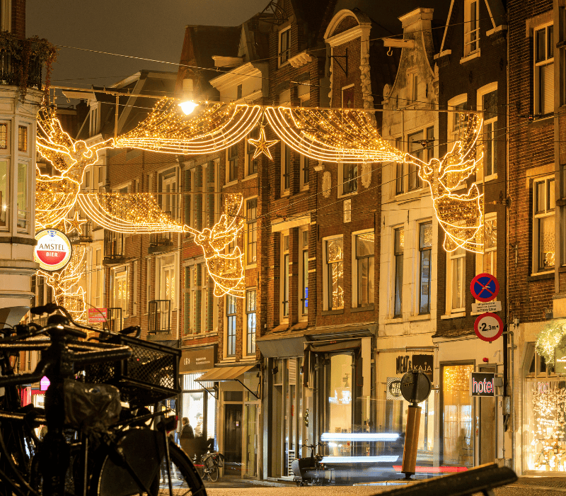 Straat sfeerverlichting met engelenoverspanning in de Utrechtsestraat